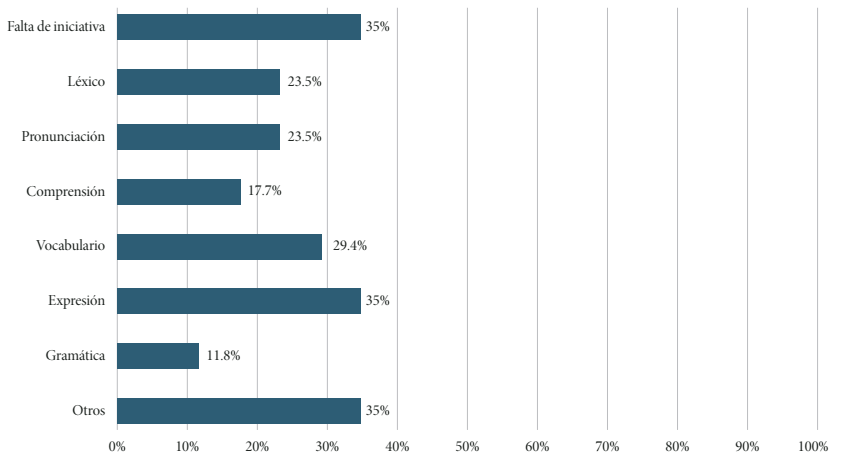 Asimismo, algunos/as participantes muestran preocupación por la dificultad de los y las estudiantes en el nivel de compresión (17.7 por ciento), ya que muestran concepciones erróneas respecto a las ideas que se trabajan. También se mencionan, en menor medida, otras dificultades referentes al léxico (23.5 por ciento), a la pronunciación de algunas palabras (23.5 por ciento) e incluso a otros elementos como la entonación, la fluidez, la técnica vocal o la influencia de otras lenguas (35 por ciento). Los problemas en la gramática y en el léxico se vinculan especialmente con el predominio del uso de la lengua española y el bajo dominio de la lengua catalana, que es la lengua vehicular (L1) en las escuelas catalanas, y también la lengua vehicular en la mayoría de las asignaturas de los GEI y GEP de las universidades participantes, y en algunas asignaturas del MFPS. Como menciona uno de los participantes del GEI: