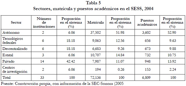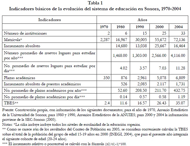 En este sentido los pasados treinta años son determinantes en la evolución reciente del sistema de educación superior en Sonora (SESS). En este periodo el sistema registra un acelerado y notorio crecimiento. Los indicadores básicos de la educación terciaria instituciones, matrícula, tasa bruta de escolarización superior (TBES) y puestos académicos muestran con claridad las dimensiones del crecimiento. Como se menciona antes en 1970, el estado cuenta con dos establecimientos de nivel superior; la matrícula asciende a poco más de 2 mil estudiantes; la TBES es de 2.4%; y los puestos académicos suman 350. Tres décadas después, en 2004, los mismos indicadores se elevan notoriamente. Las instituciones ascienden a 33; la población estudiantil supera los 72 mil estudiantes; la TBES se sitúa en 35%; y las plazas académicas son más de 6 mil. Sin duda una expansión amplia y generada en poco tiempo.