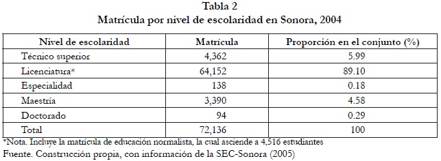 2. Matrícula, niveles de escolaridad y áreas de conocimiento en la educación superior en Sonora