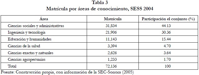 De acuerdo con la información contenida en la tabla 3, poco más de cuatro de cada 10 estudiantes en el SESS opta por programas de estudios ubicados en las ciencias sociales y administrativas; y tres de cada 10 por el área de ingeniería y tecnología. En cierta manera, las preferencias de los estudiantes por estas áreas tienen respaldo en las señales que emiten los mercados profesionales, pues son los campos profesionales donde se crea el mayor número de puestos de trabajo, y se espera continúen aumentando en los próximos años (Mungaray, et al, 2003). La tercera posición la ocupa el área de educación y humanidades, con poco más de 15% del total de la matrícula., la demanda de estos programas, especialmente los relacionados con la educación, es explicable por el aumento que registra el sistema de educación estatal en todos sus niveles de escolaridad, sobre todo a partir de la década de 1980. Las áreas de ciencias de la salud y exactas y naturales tienen una proporción similar, alrededor de 4% cada una de ellas. En el primer caso los programas escolares son escasos y relativamente de reciente creación en el estado, lo cual explica su poca participación en el conjunto. Por su parte las ciencias exactas y naturales tradicionalmente cuentan con demanda menor debido a que la industria en el país no abre puestos de trabajo para los egresados de estos campos, no obstante la proporción es destacada si se toma en cuenta que en el país esta última área alcanza poco menos del 2% del total de la matrícula (ANUIES, 2004). Finalmente, el área con menor participación es ciencias agropecuarias, lo cual es lógico si se considera que el agro sonorense registra una prolongada crisis iniciada desde la década de 1960 aunado a su creciente tecnificación (Vázquez, 1991), lo que explica la menor demanda de profesionales en este campo.
