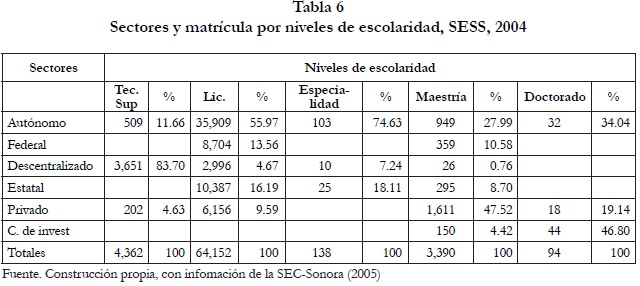 La llegada de miles de jóvenes al nivel superior en Sonora no sólo amplía las dimensiones del sistema, sino que también opera como fuerza de presión para la apertura de nuevos tipos de instituciones. En la actualidad existen más de treinta establecimientos de muy diversas magnitudes y características, desde las pioneras y abultadas instituciones, hasta recientes establecimientos de pequeña dimensión, pasando por centros de investigación y posgrado. Una manera de ordenar analíticamente este numeroso conjunto de establecimientos es agruparlo por sectores6. Para realizar este ejercicio se toma como criterio básico de diferenciación la regulación institucional7. Con base en ello se tienen seis sectores: autónomo, tecnológicos federales, descentralizado, estatal, privado y centros de investigación. La tabla 4 concentra la información al respecto.