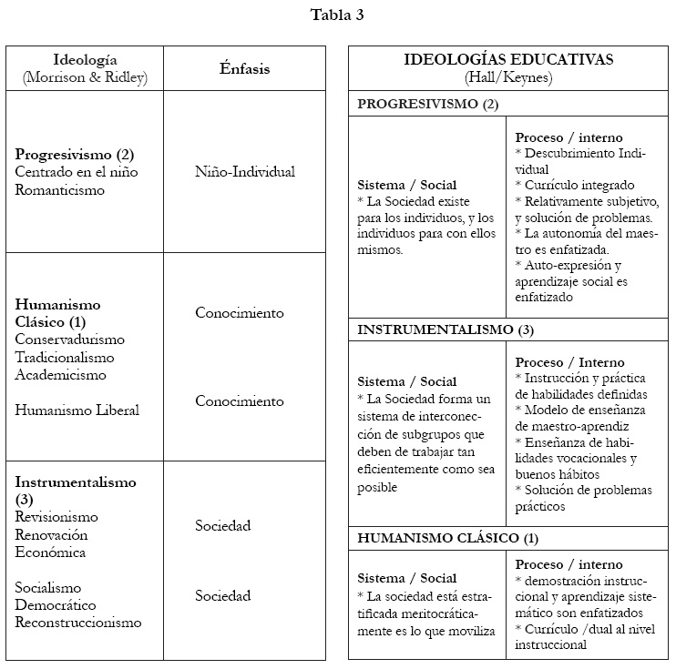 Pero la ideología en la educación es una temática compleja de estudio. En las décadas de los sesenta y los ochenta la mayoría de estudios se desarrollaron alrededor del currículo escolar y la enseñanza (Bowles & Gintis, 1976; Grace, 1978) (que serian los niveles dos y tres de intervención de la ideología mencionados por Lawton). Existen básicamente dos aproximaciones centrales de la ideología en la educación, una teorética y otra empírica, esta última expresa la llamada "influencia amplia" (Hargreaves & Tickle, 1980; Hall & Keynes, 1986; Meighan, 1987). En esta última, la idea central es que cada individuo (o grupo de individuos) que se engancha en actividades educativas sostiene alguna ideología educativa. Tal ideología es lo que hace al sujeto actuar en un contexto educativo; esta ideología es más que una ayuda para entender o malentender las actividades educativas, son factores que guían la practica educativa. Desde la perspectiva de Hall & Keynes (1986), se establece que las ideologías educativas tienen por lo menos tres elementos centrales: una visión del aprendiz, presupuestos acerca de la sociedad y del conocimiento. Por otro lado, para Bartlett (2001) cada ideología incorpora diferentes presupuestos sobre la naturaleza humana (el aprendiz), el trabajo de la sociedad y del conocimiento. La Tabla 3 delinea los aspectos más relevantes de las ideologías educativas y sus diferentes énfasis (Meigham & Siraj-Blatchford, 1981; Morrison & Ridley, 1989; Bartlett & Burton, 2001).