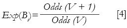 Así, si para la variable ingreso per cápita, la exponencial de Bi (Exp(Bi)), los odds de los jóvenes de una familia que incrementa su ingreso per cápita en V+1 son ExpBi veces los de aquellos que no tienen los (V) adicionales, lo que se conoce como odds ratio (ver fórmula [4]).