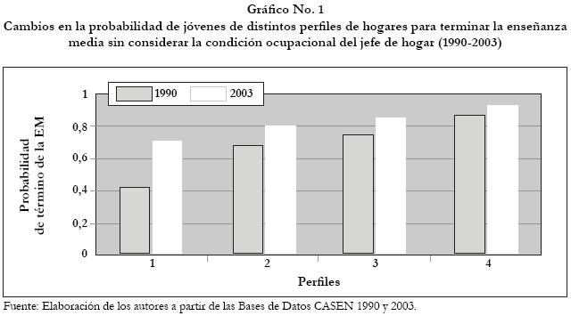 El Gráfico 1 presenta las probabilidades que perfiles de hogar, para concluir su enseñanza tienen los jóvenes, provenientes de distintos secundaria en el periodo 19902003.