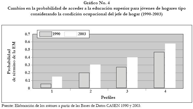 Si para el acceso a la educación superior se consideran los cuatro perfiles de hogar analizados anteriormente, sobre término de la enseñanza secundaria (ver los perfiles de hogar tipo en Tabla 2), se observa que, en general, han aumentado las probabilidades de acceso para el periodo 19902003 (ver Gráfico 3)
