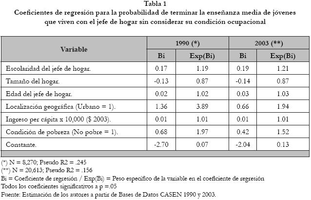 Los modelos de regresión que se presentan en este artículo apuntan, precisamente, a estimar, por una parte, la probabilidad de haber terminado la enseñanza media de los jóvenes de 18 a 24 años y, por otra, el acceso de dicho grupo a la educación superior a partir de algunas variables de caracterización de sus hogares. Las variables independientes son las siguientes y se han tomado de las encuestas CASEN 1990 y 2003.6