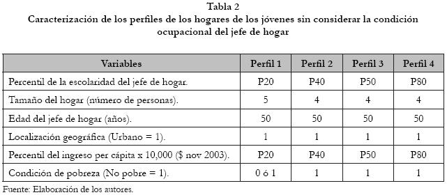 A cada una de las variables arriba enunciadas se le asignó arbitrariamente un valor tal como se detalla en la Tabla 2 Para construir los perfiles, de modo que fueran representativos de hogares tipo, se escogieron algunos percentiles (P) para las variables: escolaridad del jefe de hogar (P20, P40, P50 y P80) e ingresos per cápita (P20, P40, P50 y P80), las cuales pueden asociarse a puntos específicos de una distribución estadística típica.