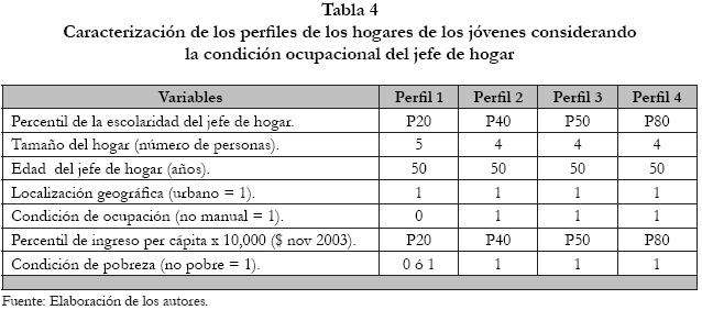 En la Tabla 4, al igual que en la tabla anterior, se muestra la posibilidad que un joven concluya su enseñanza secundaria considerando distintos perfiles de hogares según a) Percentil de la escolaridad del jefe de hogar; b) Tamaño del hogar; c) Edad del jefe de hogar; d) Localización geográfica del hogar; e) Percentil de ingreso per cápita; y f) Condición de pobreza. Pero, adicionalmente, se agregó al modelo la variable ocupación del jefe de hogar. De modo similar a lo realizado anteriormente, para establecer los perfiles de hogares tipos se les asignaron los mismos valores arbitrarios señalados en la Tabla 2 y para el caso de la variable "ocupación del jefe de hogar" se consideró que para el primer quintil se estaba en presencia de trabajadores manuales (0) mientras que para los quintiles 2, 3, y 4 se estimó que los jefes de hogar tenían la condición de trabajadores no manuales (1).