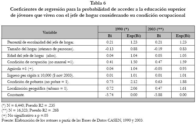 En lo que concierne a la bondad del modelo para predecir el acceso a la educación superior, considerando de manera adicional la variable ocupación del jefe de hogar, se corrobora que en el caso del año 2003 el nivel de predictibilidad es mejor que para el año 1990 y superior respecto al modelo analizado previamente y que no considera la situación ocupacional del jefe de hogar. En efecto, para el año 2003 el Pseudo R2 es de 0.268 y para el año 1990 es de 0.235.