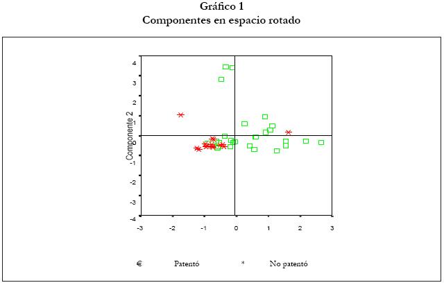 La representación gráfica en el espacio rotado de las universidades (gráfico 1) empleando los componentes obtenidos y diferenciando en función de si desarrollan o no patentes, permite extraer ciertas conclusiones sobre la capacidad de las universidades para generar patentes. En general, la totalidad de universidades que no han desarrollado patentes tienden a situarse en el cuadrante inferiorizquierdo, lo que implica valores reducidos en ambas componentes. Se trataría de universidades que, por un lado, no tienen un perfil politécnico, con menores relaciones con el sector empresarial, traduciéndose en un menor volumen de recursos financieros dedicados a investigación aplicada y/o de carácter privado. Por otro lado, tampoco tienen unos resultados de investigación "académicos" reconocidos a través de sexenios, publicaciones, PDI doctor o tesis leídas.