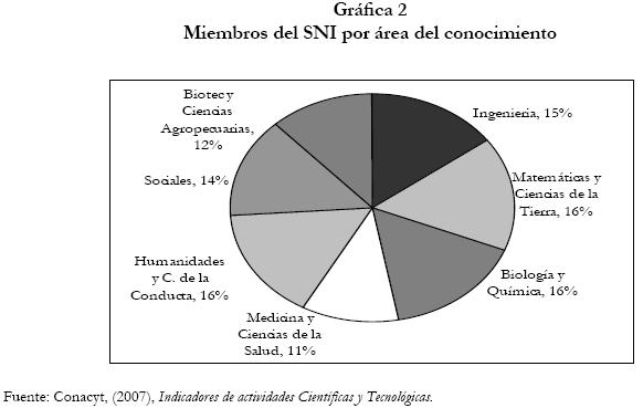 El propio Conacyt clasifica a los investigadores adscritos al SNI en siete áreas de conocimiento: físicomatemáticas y ciencias de la tierra; biología y química; medicina y ciencias de la salud; humanidades y ciencias de la conducta; ciencias sociales; biotecnología y ciencias agropecuarias; e ingenierías. De ellos, 14% están adscritos a las ciencias sociales en sus diversas disciplinas (Gráfica 2).