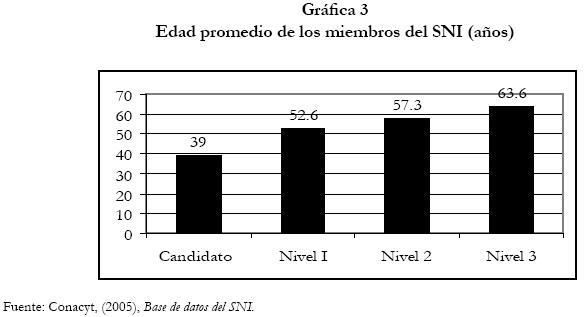 En términos generales, es posible decir que la edad promedio de los investigadores mexicanos adscritos al SNI es de 58 años; sin embargo, los grupos de edad difieren en función del nivel al cual se encuentran adscritos. Por ejemplo, puesto que para poder integrarse como candidatos SNI un requisito es contar con menos de 40 años de edad, encontramos que la edad promedio en este nivel es de 39 años, lo cual permite reconocer que la mayoría de los incorporados al SNI como candidatos están en el límite de edad para ello. Por su parte, los miembros del SNI con nivel I tienen en promedio 52.6 años y los del nivel II 57.3 años, sólo los integrantes del nivel III registran en promedio 63 años de edad (Gráfica 3). Si atendemos los promedios de edad de quienes forman parte del SNI podemos afirmar que la planta de investigadores en México se encuentra por arriba de los 50 años y que, en el mediano plazo tenderá a reducir su nivel de productividad y será preciso ser sustituida por nuevos.