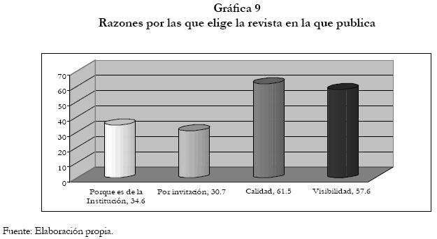 Si bien los resultados fueron ampliamente variados, la mayoría hizo referencia en primer lugar a la calidad y visibilidad; sin embargo, en segundo lugar, manifestaron preferir las revistas editadas por su propia institución o bien aquellas de las que reciben una invitación expresa para publicar (Gráfica 9).