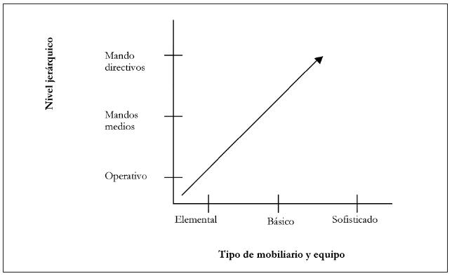 Asimismo, la calidad (que no necesariamente el gusto) del mobiliario participa de este proceso, por ejemplo la decoración y equipamiento de las oficinas de los jefes de Departamento es muy similar entre sí, pero difiere con las de una secretaria o un auxiliar. De esta forma, es factible establecer una correspondencia entre la calidad de los objetos y el nivel de responsabilidades del funcionario en cuestión. El gráfico siguiente ilustra este postulado.