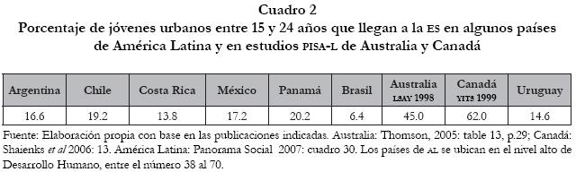 El cuadro 2 muestra estimados hechos para países de América Latina con alto Desarrollo Humano (PNUD, 2007/2008) y para otros estudios longitudinales de tipo PISAL en los cuales se reporta la tasa de asistencia a la ES entre los 18 y los 20 años. A igual desarrollo humano sólo Brasil tiene una menor cobertura en educación superior y Costa Rica tiene un guarismo ubicado en el mismo orden. Argentina, Chile, México y Panamá tienen coberturas superiores. Los dos países PISAL alcanzan tasas sustantivamente más altas. Australia casi duplica la matrícula nuestra. Thomson (2005: 13) informa que en la cohorte 1995, el 41% de los jóvenes encuestados se habían inscrito en la siguiente cohorte, que cursó 9º grado en 1998, el 45.0% llegó a la educación superior. En Canadá la tasa es aún superior: algo más de seis de cada diez jóvenes de la cohorte de 1999 accedieron a la es (Shaienks et al., 2006: 13).