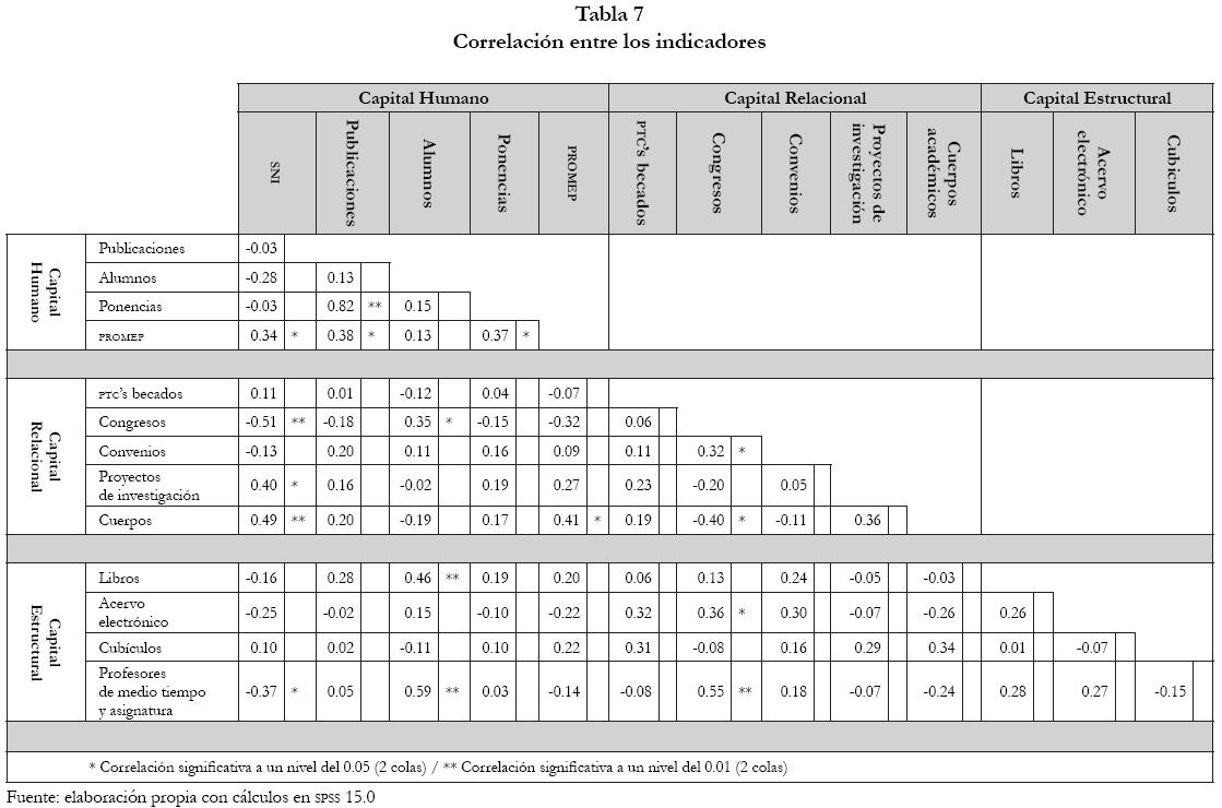 Por su parte, los indicadores PROMEP y cuerpos académicos obtuvieron un mayor peso en el capital relacional, el primero por las actividades que están ligadas con dicho programa: al realizar tutoría, exponer en congresos, contactar a otros profesores para realizar publicaciones, etcétera; establece gran cantidad de redes importantes para difundir el conocimiento; el segundo porque al realizar trabajo en equipo con temas similares, se originan fuertes redes de contacto dentro y fuera de la propia institución; además presenta una carga factorial alta dentro del capital humano, ya que el desarrollo del trabajo en equipo es una rica fuente para desarrollar habilidades individuales (Nonaka y Takeuchi, 1999).