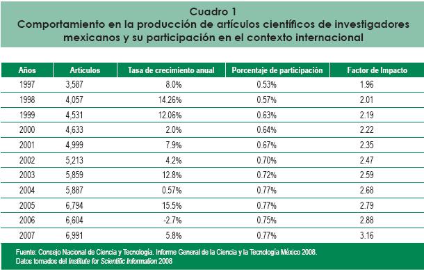 La participación de los investigadores mexicanos en la publicación de artículos científicos a escala mundial, aunque en dimensiones cortas, ha venido creciendo gradualmente. Esto se puede observar en el cuadro uno.