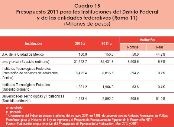En el marco general del PEF antes descrito, a la SEP (Ramo 11) se le ampliaron $12,767 millones y se le redujeron $909 millones, por lo que la variación neta (reasignaciones) fue de $11,859 millones para quedar en un presupuesto aprobado de $230,685 millones. Si a la SEP se suma el presupuesto del ramo 25 "Previsiones y Aportaciones para los Sistemas de Educación Básica, Normal, Tecnológica y de Adultos" y de los fondos educativos del Ramo 33 "Aportaciones Federales para Entidades Federativas y Municipios", se tiene un total de $536,468 millones, 2.9% más que el presupuesto aprobado para 2010 (cuadro 9).