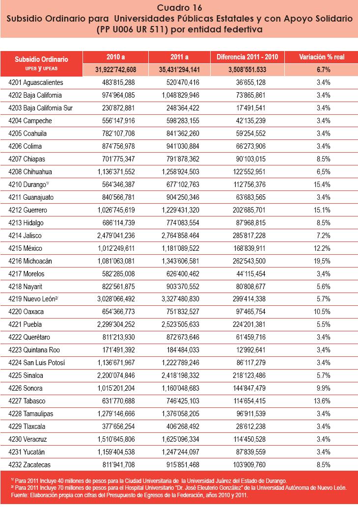 El subsidio federal ordinario para las Universidades Públicas Estatales y con Apoyo Solidario (UPES y UPEAS), recursos considerados en el Programa Presupuestario U006 de la Unidad Responsable 511 (Dirección General de Educación Superior Universitaria) pasaba de $31,923 millones aprobados en 2010 a $32,897 millones, lo que representaba una disminución real del 0.9%. De acuerdo con información proporcionada por la SEP, en el proyecto no estaba considerada la política salarial y las nuevas necesidades para 2011 (nivelación salarial de carrera docente, costo de la actualización de plantilla, promociones académicas, etc), lo que representaría severos problemas de viabilidad financiera para la operación de las universidades.