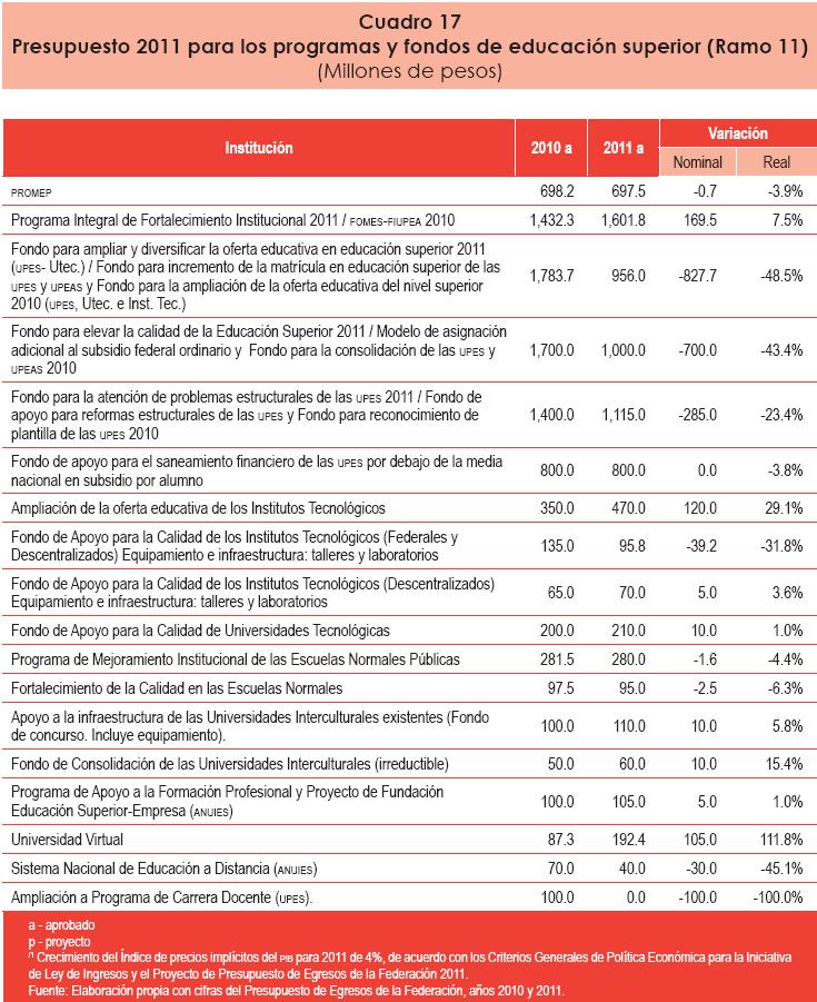 Ocho de los fondos existentes hasta 2010 destinados para las UPES y UPEAS se fusionaron en cuatro fondos: el Fondo para la Modernización de la Educación Superior (fomes) y el Fondo de Inversión para Universidades con Evaluación de ANUIES (FIUPEA) se agruparon en el Programa Integral de Fortalecimiento Institucional; los fondos para Incremento de Matrícula en Educación Superior de las UPES y UPEAS y para Ampliación de la Oferta Educativa en Educación Superior se agruparon en el Fondo para Ampliar y Diversificar la Oferta Educativa en Educación Superior; el Fondo para la Consolidación de las UPES y UPEAS y el Modelo de Asignación Adicional al Subsidio Federal Ordinario (Fórmula CUPIA) se fusionaron en el Fondo para Elevar la Calidad de la Educación Superior, y los fondos de Apoyo para Reformas Estructurales y de Reconocimiento de Plantilla de las UPES se integraron en el Fondo para la Atención de Problemas Estructurales de las UPES. Por su parte, en el proyecto para 2011 continuaron el Programa de Mejoramiento del Profesorado (PROMEP) y el Fondo de Apoyo para el Saneamiento Financiero de las UPES por Debajo de la Media nacional en Subsidio por Alumno, además del Programa Nacional de Becas para Educación Superior (PRONABES), fondo dirigido a los estudiantes que no se otorga a las instituciones. De la comparación de los recursos propuestos para los fondos de 2011 con los aprobados el año anterior, se tenía una disminución nominal de $1,694 millones a pesos corrientes, y de $2,000 millones a pesos de 2011. La variación resultaba negativa en 25% y aún mayor si se comparaba con los recursos otorgados en 2009, pues en 2010 se les aplicó un recorte desde la iniciativa del Ejecutivo.