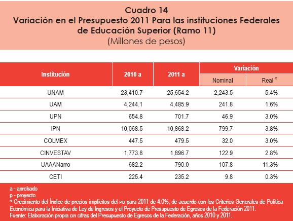 Si bien el presupuesto aprobado para 2011 tuvo una variación porcentual real mayor que la observada en 2010 (3.9% y 1.9%, respectivamente), no todas las IES públicas se beneficiaron en esta medida. La UNAM y la Universidad Autónoma Agraria Antonio Narro, como IES federales, podrán fortalecer sus programas académicos, la primera de ellas por el trato favorable que el Ejecutivo le dio desde el proyecto presupuestal. A diferencia de ello, otras instituciones contarán con recursos insuficientes en 2011. En el caso de las UPES, la situación será variable debido a las ampliaciones diferenciales aprobadas por los diputados: alrededor de la mitad con un incremento real del 3.4% apenas podrán cumplir con los compromisos laborales establecidos con sus sindicatos, en un escenario de incremento salarial de alrededor del 3.9%, porcentaje otorgado en las revisiones de varias universidades y fijado como "tope salarial" por las autoridades hacendarías para las negociaciones laborales del año.13