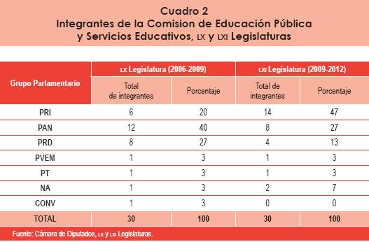 Dado que el Presupuesto de Egresos de la Federación (PEF) es aprobado exclusivamente por la Cámara de Diputados (a diferencia de la Ley de Ingresos que es aprobada por ambas cámaras), la integración de una nueva legislatura representa una nueva correlación política en su interior, de acuerdo con el número de legisladores que tiene cada uno de los grupos parlamentarios. El pleno de la LXI Legislatura tuvo una composición muy distinta a su antecesora, misma composición que tienen todas las comisiones ordinarias, como es el caso de la de Educación Pública y Servicios Educativos (CEPYSE). En el cuadro 1 se observa el cambio en los porcentajes de cada bancada. Destaca el fortalecimiento del Grupo Parlamentario del PRI, que pasó del 21 % en la LX Legislatura al 47% en la LXI. De 106 diputados alcanzó 237, conformando así la primera minoría. A diferencia de ello, los grupos del PAN y del PRD tuvieron una severa disminución proporcional. El primero, de haber conformado la primera minoría con el 41% en la lx Legislatura (206 diputados), redujo su participación al 28% (142 diputados), mientras que el PRD redujo casi a la mitad el número de diputados (de 127 a 69), representando el 14%. Los restantes cuatro grupos parlamentarios: Partido Verde, Partido del Trabajo, Convergencia y Partido Nueva Alianza, mantuvieron en conjunto el 10 y 11 % en ambas Legislaturas.