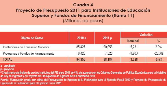 El proyecto para 2011 en ambas subfunciones presentaba una variación negativa de 0.7%. Por ramos, solamente el 33 (FAM) y el 07 (SEDENA) incrementaban sus recursos, mientras que el Ramo 08 (SAGARPA) presentaba una severa disminución de 16.5%, al igual que el Ramo 25 (normal D.F.) con 10.1% y el ramo 11 (SEP) con 0.5%. Si bien nominalmente, a pesos corrientes, el presupuesto de ambas subfunciones aumentaba en $2,785 millones, a pesos de 2011 la disminución ascendía a $601 millones. Cualquier análisis que se hiciera identificaba que la iniciativa del Ejecutivo afectaba el desarrollo de la educación superior.