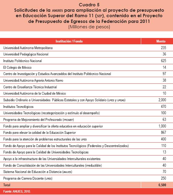Con base en el análisis de los montos propuestos para las instituciones y para distintos programas y fondos de financiamiento, la ANUIES solicitó una ampliación presupuestal al Ramo 11 por la cantidad de $6,500 millones, desglosadas como se indica en el cuadro 5.