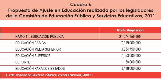 "Los secretarios e integrantes de la Comisión de Educación consideran que el Proyecto de Presupuesto de Egresos de la Federación para el Ejercicio fiscal 2011, en los ramos educativos, no contribuye al alcance de los objetivos propuestos para la transformación de la educación. Asimismo los diputados opinan que los recursos que otorgan son menores en términos reales que el anterior ejercicio fiscal. Por lo tanto, no conlleva a la consolidación de la educación como eje clave para el desarrollo del país" (Comisión de Educación Pública y Servicios Educativos, 2010: 6)
