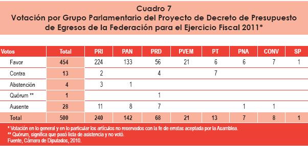 10 La mayoría de los temas inscritos a discusión, como ha ocurrido en años anteriores, fueron desechados por el pleno en sesión maratónica que cubre la formalidad parlamentaria, pero que difícilmente modifica los acuerdos políticos alcanzados. De las reservas presentadas, los grupos parlamentarios del PRI, PRD y pt solamente consiguieron que se incluyeran a última hora recursos para las prestaciones de trabajadores de la Cámara de Diputados y se aumentaran las partidas para pagos a exbraceros. Los diputados panistas de la CNC tampoco lograron restituir los $4,500 millones que les habrían sido recortados para las ampliaciones al programa del campo. Los artículos particulares reservados se aprobaron por 337 votos a favor, 58 en contra y dos abstenciones (Arvizu, Juan et al., 2010).