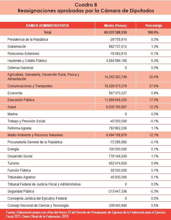 Tan solo cinco ramos presupuéstales recibieron el 89% de las reasignaciones aprobadas para los ramos administrativos (cuadro 8). La que mayores recursos adicionales recibió fue la Secretaría de Comunicaciones y Transportes con el 28%; le siguió la Secretaría de Agricultura, Ganadería, Desarrollo Rural, Pesca y Alimentación con el 20%; la Secretaría de Educación Pública ocupó el tercer sitio con el 17%, seguida por las secretarías de Salud y del Medio Ambiente y Recursos Naturales con el 12% cada una. El restante 11% de las reasignaciones de los ramos administrativos se repartió entre las otras 18 secretarías y dependencias administrativas, de las cuales la Procuraduría General de la República y las secretarías de Seguridad Pública y de Trabajo y Previsión Social tuvieron recortes netos al proyecto enviado por el Ejecutivo, por cerca de $326 millones (0.5% de las reasignaciones).