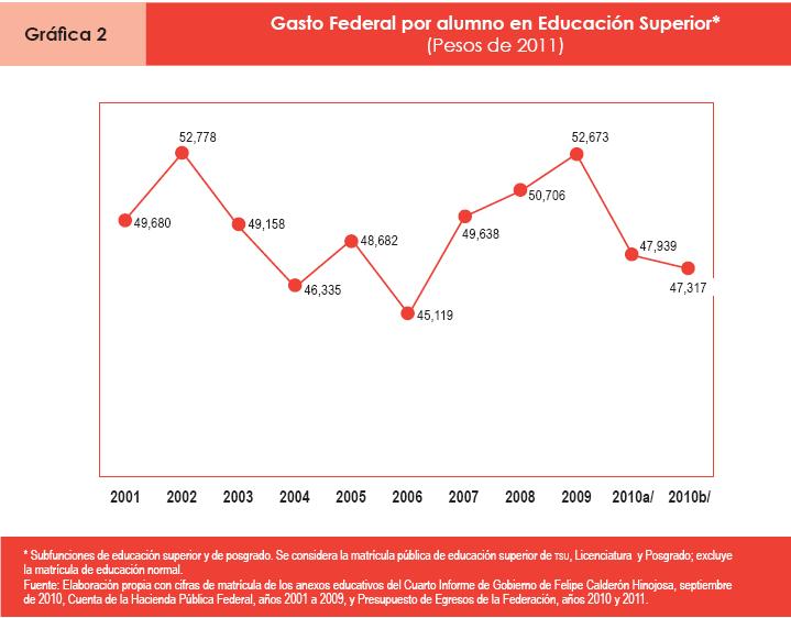 Con los valores estimados del PIB en los Criterios Generales de Política Económica para 2010 y 2011, los montos que se proponían en educación superior y posgrado como porcentaje del PIB retrocedían tres centésimas de punto, al pasar del 0.65% a 0.62%. Además, con la estimación de la matrícula pública de educación universitaria y tecnológica para el ciclo escolar 20102011 presentada en el Cuarto Informe de Gobierno, el gasto federal por alumno de educación superior pública, a pesos de 2011, disminuía de $47,939 a $45,227.
