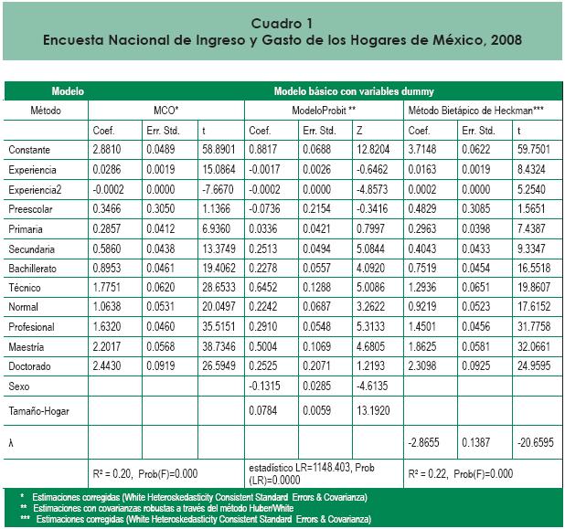 Los resultados que arroja el primer modelo que contempla la experiencia laboral en forma lineal y cuadrática, así como el vector de variables dicotómicas para cada uno de los grados de escolaridad, son corregidos por el método bietápico de Heckman y se obtiene errores estándar robustos a través del procedimiento de White (1980). La primera etapa consistió en estimar un modelo Probit a través de máxima verosimilitud, en donde la variable dependiente es dicotómica tomando el valor de uno si el jefe de hogar participa en el mercado de trabajo y cero en caso contrario. Como variables explicativas se utiliza la experiencia laboral, experiencia laboral al cuadrado, escolaridad, sexo y tamaño de hogar, siendo las tres primeras parte de x y este vector un subconjunto estricto de z.
