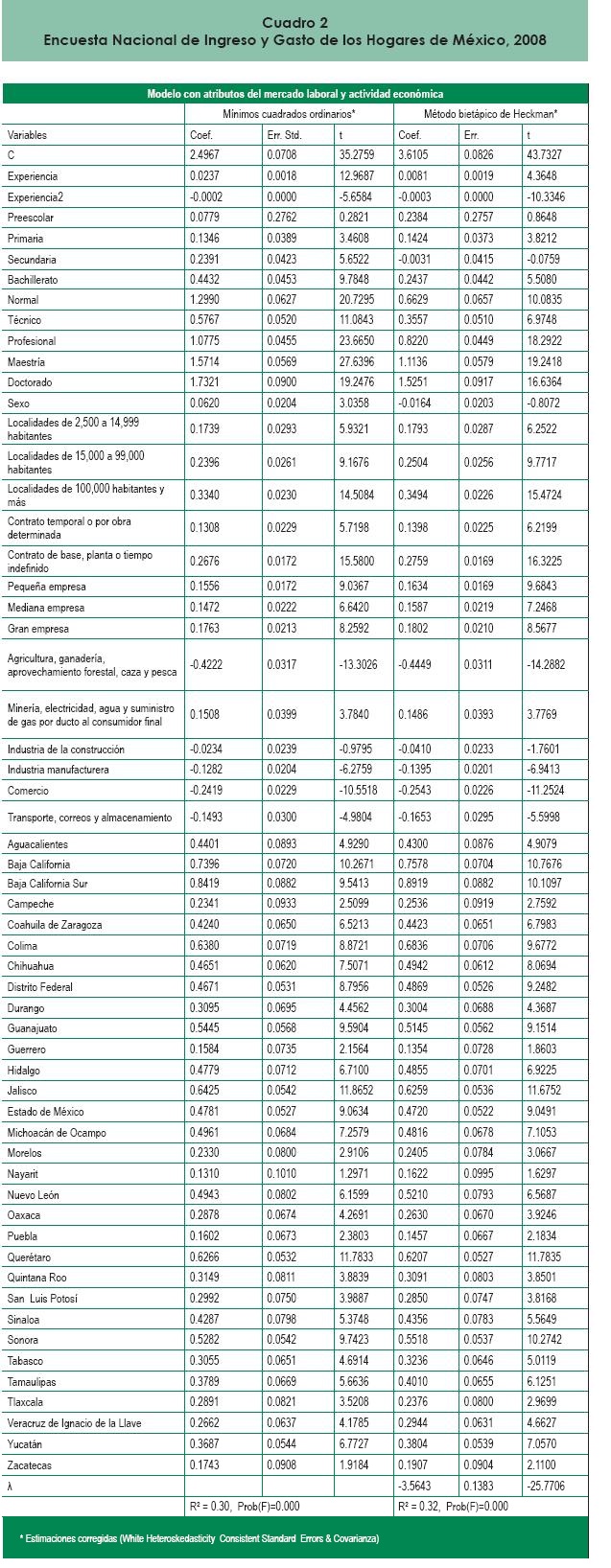 En la visión de Burgos y Mungaray (2007) se trabaja con una estructura de datos de corte transversal para los años 1984, 1989, 1992, 1996, 1998, 2000 y 2002. Se utiliza mínimos cuadrados ordinarios y obtienen errores estándar robustos ante la presencia de heterocedasticidad mediante el método de White (1980). Se afirma que la dispersión salarial es mayor en la manufactura, comercio y servicios y se encuentra que existe una importante variabilidad en los coeficientes relacionados con el tipo de región, lo que puede estar indicando un cambio en su configuración. Para Urciaga y Almendárez (2008) la estrategia econométrica es estimar una ecuación básica y extendida que considera una desagregación de los niveles de escolaridad en trece ciudades del norte del país con información de la Encuesta Nacional de Empleo Urbano (ENEU) de 2002. La versión restringida del modelo sugiere que los rendimientos de la educación han sido mayores para los hombres que para las mujeres, mientras que en el modelo extendido a otros atributos se concluye que los mayores rendimientos están asociados al nivel de escolaridad más elevado (posgrado). En Ordaz (2007) también se utiliza información de la ENIGH para el periodo de 1994 a 2005 y se instrumenta la metodología de Heckman (1979), para eliminar el problema de sesgo por autoselección muestral. Los resultados sugieren que existen diferencias en las tasas de rentabilidad educativa por sexo, pues los retornos a la educación en las mujeres rurales son superiores a los de las mujeres urbanas. Con información de la Encuesta Nacional de Empleo Urbano (ENEU) para el periodo de 19942001, Cabrera et al. (2008) estima una función de ingresos utilizando datos de panel y se advierte que la escolaridad es una variable relevante en la determinación de los ingresos para los trabajadores de las ciudades de Tijuana y Mexicali, lo que implica una elevada exigencia del mercado de trabajo local en materia de educación. Se plantea la necesidad de fortalecer constantemente el vínculo entre los centros de producción y de educación básica, media y superior. Desde una perspectiva regional en Castro y Morales (2011) se apunta que la brecha en la desigualdad regional desde 1995 se ha reducido en las regiones de México pero se afirma que se ha incrementado entre ellas.