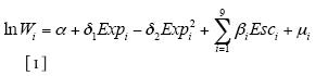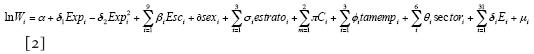 Donde lwi denota el logaritmo natural de los ingresos reales por hora del jefe de hogar y Expi y Expi2 representan la experiencia laboral potencial en virtud de que no es observable la experiencia real en las bases de datos de la ENIGH (2008). La variable sexi representa el sexo y asume un carácter dicotómico tomando el valor de uno cuando el jefe de hogar es hombre y cero si es mujer. La inclusión de esta variable permite evaluar si existen diferencias en los ingresos por razón de sexo. El termino