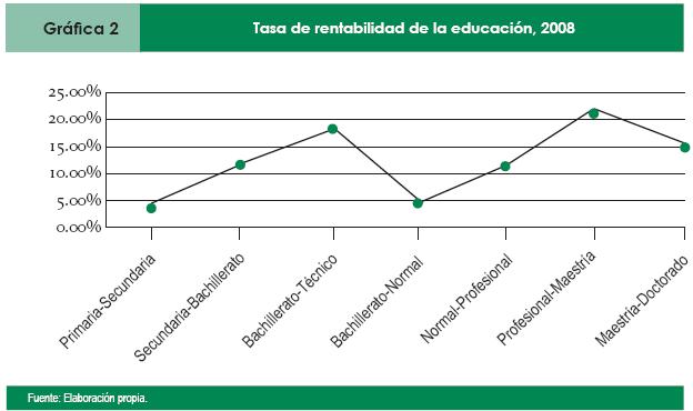 La tasa de rentabilidad marginal calculadas a partir de la metodología de Psacharopoulos (1993) muestra que al transitar de un nivel de instrucción formal a otro mejoran los incentivos para participar en el mercado de trabajo. Esto significa que cuando la fuerza laboral adquiere e innova nuevos aprendizajes y conocimientos de carácter profesional y especializados, le es posible desplegar mayores capacidades y habilidades que inciden en la productividad y competitividad laboral. Esto sugiere que los ingresos están íntimamente ligados con las capacidades y habilidades del trabajador, lo que le concede un papel importante a los factores de oferta del mercado de trabajo dentro de la estructura salarial.