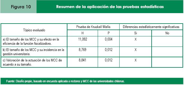 Como corolario y luego de analizar los diversos factores relacionados con el tamaño de los MCC, especialmente los resultados de las pruebas estadísticas aplicadas (Figura 10), es factible comprobar nuestra conjetura inicial, que presuponía que "el agente y principal de las universidades chilenas tienen percepciones distintas de la dimensión de los MCC y su efecto en la eficiencia de la gestión universitaria".