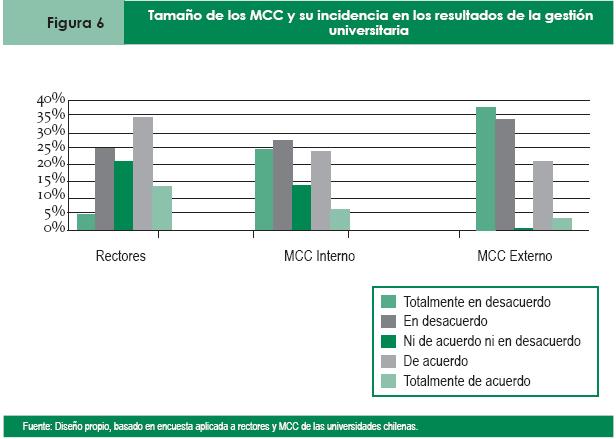 Para completar lo señalado en el punto anterior se intentó obtener información de los encuestados en relación con la incidencia que pudiese tener el tamaño de los MCC en los logros de la gestión universitaria. Esta información se obtuvo al plantearles al agente y principal la declaración siguiente: "el tamaño de los MCC no tiene incidencia en los resultados de la gestión universitaria". Las respuestas están divididas entre los que están "en desacuerdo" y los que están "de acuerdo", tanto es así que en el primer caso el porcentaje promedio de respuestas llega a 30% y el segundo llega dos puntos más abajo. De todas formas, existe casi ¼ de las respuestas que manifestaba su "discrepancia total" con el enunciado, postura que lideran los MCCC externos con prácticamente 40% (porcentaje al que si se suma la opción "en desacuerdo" supera 70%); luego siguen los MCC internos con 25%; en menor medida los rectores con 4.3%. Son los agentes los que concuerdan con el postulado inicial, hecho que queda demostrado en 35% y 13% de respuestas en la opción "de acuerdo" y "totalmente de acuerdo", respectivamente. En el caso de los MCC, 14.8% promedio asumen las alternativas anteriores.