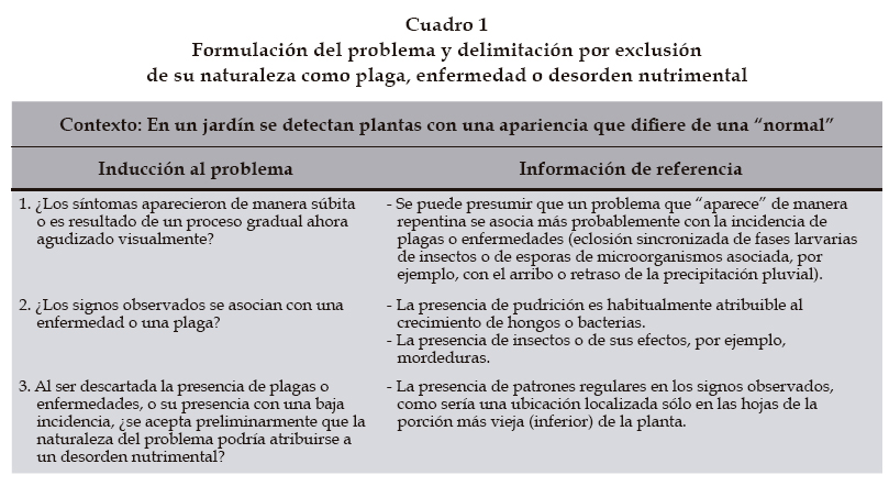 Metodológicamente, la presente propuesta consiste en que, a partir de la observación de una población de plantas (el sistema), cuyas características se desvían de una apariencia "normal" (sana, verde, hidratada vigorosa), se plantea elaborar un diagnóstico a partir del FDP mostrado a continuación (Tabla 2), en el que se incluye una amplia selección de signos de orden biológico, factores ambientales y culturales. La descripción del problema se define en función de los tópicos marcados con X, los cuales harán las veces de guía para formular un diagnóstico presuntivo.