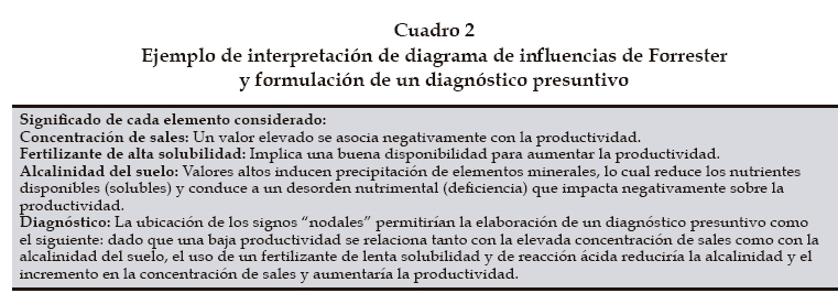 La propuesta metodológica del caso que nos ocupa versa sobre un tópico del área biológica, formulada para propiciar un aprendizaje significativo. Con este fin se eligió la modalidad del diagnóstico de escenarios-problema relacionados con desórdenes nutrimentales o incidencia de plagas en plantas, donde se combinó un formato para registrar signos y elaborar un diagnóstico presuntivo (en adelante, FDP) con los diagramas denominados de influencias o causales de Forrester (Aracil, 1995: 19-25), utilizados en el programa Vensim Ple® (http://www.vensim.com, acceso: 26 de noviembre de 2012) a partir de los cuales se formula un diagnóstico.