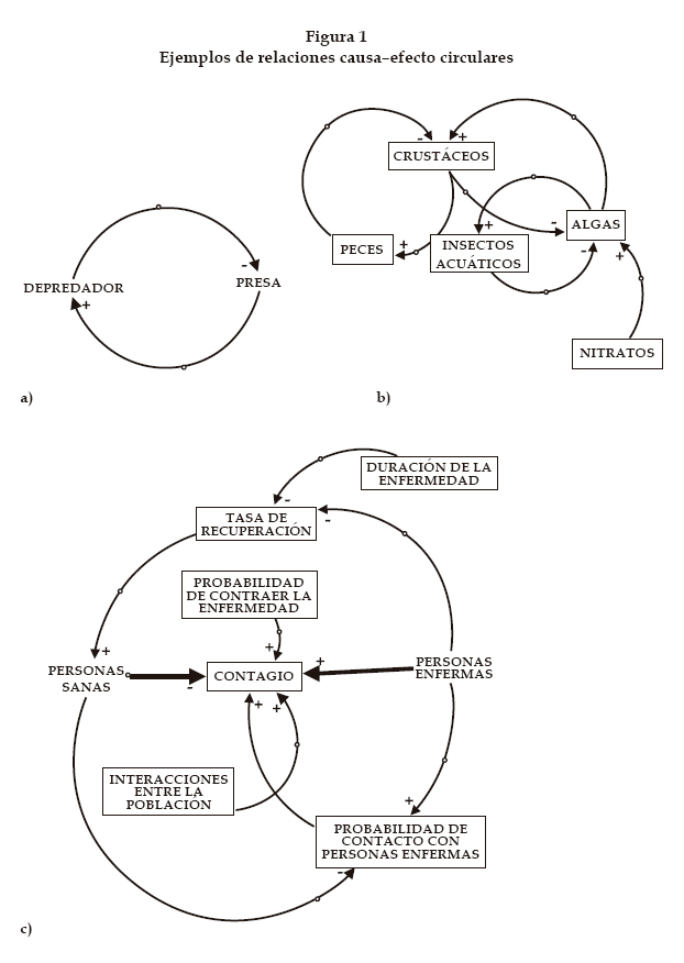 Dicha manera de concebir un "sistema" y sus relaciones inherentes como una suerte de representación esquemática, si bien resulta operativa para el manejo de relaciones causa-efecto que distinguen al pensamiento lineal, la naturaleza de las diversas relaciones X vs. Y, resultan limitadas, en virtud de que dicho enfoque de causalidad lineal contrasta con aquél donde explícitamente se aceptan las relaciones causa-efecto circulares (Figura 1). En las que la causa induce el efecto y viceversa, como en el caso de las relaciones tróficas (relación depredador-presa), cuya implicación indica que una mayor proporción del depredador involucra una menor de la correspondiente a la presa y viceversa (Figura 1a), lo que se denomina el principio de la recursividad organizacional, que aparece cuando los productos y los efectos son al mismo tiempo las causas y los productores de lo que los produce (Espejo, 2010: 121-122). Poco habrá que agregar acerca del enriquecimiento de una causalidad de tipo circular sobre otra lineal, si la primera es alimentada con datos (por ejemplo: de la especie-especificidad del depredador sobre su presa), con la sincronización de los ciclos reproductivos, su estrategia "K" o "r", o sus respectivos nichos ecológicos, entre otros aspectos que permitan que el estudiante apuntale la naturaleza relacional y multidimensional (Figura 1b) de los sistemas objeto de estudio. Otro ejemplo distinto al de las relaciones tróficas se refiere al proceso de salud-enfermedad (Figura 1c) para mostrar que prácticamente cualquier proceso puede ser esquematizado.