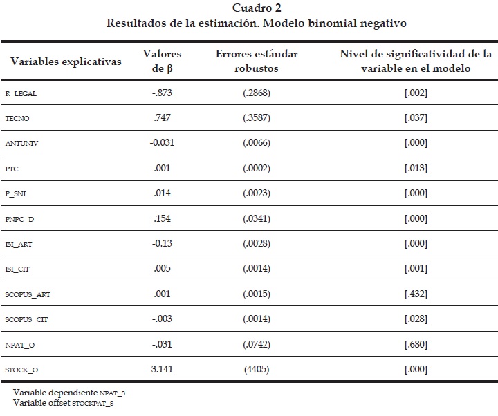 Cabe señalar que, aunque en el país existe un marco legislativo que establece la distribución de los posibles beneficios derivados de las licencias de las patentes entre instituciones e investigadores, pocas universidades han establecido una regulación interna para definir, en concreto, esta distribución de beneficios. Ello ha impedido examinar la influencia de los incentivos en las estimaciones, a partir de una participación más elevada de los investigadores en los beneficios con respecto al número de patentes de cada universidad.