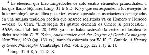 Observemos, sin embargo, en honor al debido rigor historiográfico, que este último pasaje es más precisamente un testimonio del tipo de alternativa desarrollada por los pluralistas, tras el perentorio desafío inmovilista lanzado por Parménides, para reconciliar la existencia de una multiplicidad fenoménica con el principio de unidad postulado por el filósofo de Elea. En efecto, Empédocles estuvo entre los pensadores que respondieron a la incisiva intervención del eleático asignando a un número determinado de substancias (cuatro en su sistema que se volvería después canónico)4 el carácter de 'raíz', correspondientes a lo que Aristóteles llamaría a su vez 'elementos'. Asimismo, el propio filósofo de Agrigento postuló, para la interacción entre dichas substancias fundamentales, una alternancia cíclica entre el predominio del Amor, marcado por una unidad armónica o solidaridad total de los cuatro elementos bajo la forma del
