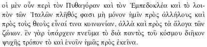 Los seguidores de Pitágoras y Empédocles, así como la restante multitud de los itálicos, afirman que hay un lazo común que nos vincula no sólo unos con otros y también con los dioses, sino además con los animales desprovistos de palabra. Dicen que existe un espíritu que se difunde por todo el universo a la manera de un alma, que también nos une con aquéllos.
