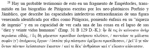 . Así pues, resulta plenamente justificado identificar una etapa fundamental del proceso de consolidación de la concepción pneumática del alma en la doctrina de la metempsícosis al parecer desarrollada (o introducida) por Pitágoras y continuada por sus seguidores.19 Tenemos evidencias, por ejemplo, de que el pitagorismo más antiguo, en el marco de la doctrina de la transmigración, desarrolló la concepción de que las almas, por ser de naturaleza pneumática, recorrían un trayecto aéreo en su paso de uno a otro cuerpo, y que dicho camino estaba por ende pletórico de ellas, las cuales lo usaban precisamente como vehículo, según veremos. Llama la atención de inmediato el interesante paralelismo que una semejante concepción presenta con la doctrina de Tales, a que ya nos hemos referido, sobre la presencia de 'dioses' en todas las cosas. Esto es, al menos, un hecho que puede establecerse a partir de un amplio reporte transmitido en la biografía de Pitágoras por Diógenes Laercio, sobre la autoridad del gran conocedor del pitagorismo Alejandro "Polyhistor" (activo polígrafo griego llevado como cautivo a Roma por Sila, que lo liberó en 82 a.C.), quien nos conserva una gran cantidad de información muy valiosa sobre contenidos doctrinales asociados con la fase más antigua de dicha secta. En el extracto de su escrito leemos el siguiente testimonio sobre la presencia en el pitagorismo antiguo de la concepción del alma cósmica y etérea, que aparece asociada con la idea del aire como lugar privilegiado de residencia de las almas: