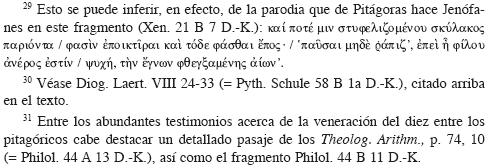 Al afirmar que, según la doctrina pitagórica referida, "todo el aire está lleno de almas", nos vemos inevitablemente remitidos a la doctrina de Tales que discutimos algunas páginas más arriba, según la cual "todas las cosas están llenas de dioses" y que encaja perfectamente en la visión hilozoísta de los presocráticos, a la que tenemos buenas razones de asociar también a Pitágoras y a su escuela. Más aún, basados en la autoridad de Aristóteles, podemos identificar incluso en el proceso de respiración del universo descrito por los pitagóricos, donde el cielo aspira tiempo y vacío desde el