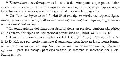 uno de los símbolos más importantes de los pitagóricos.32 En efecto, el 4, que como vimos era en potencia también el 10, se convirtió en el eje de un simbolismo que, consagrado en el máximo juramento de los pitagóricos,33 identifica la con la "fuente de la naturaleza perenne" y asocia asimismo el 4 con el alma, en cuanto estaría compuesta justamente por una tetrada:
