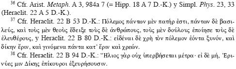 en el centro de un complejo ciclo de transformaciones que, sin embargo, obedecen a una ley inexorable y perfectamente regular.36 Más aún, Heráclito ve en la vida, tanto a nivel cósmico como a escala humana, un juego de fuerzas contrarias que entablan una lucha incesante por prevalecer una sobre la otra, según un principio que atinadamente equiparaba al modelo de la guerra,37 confrontación que veía más precisamente sujeta a un equilibrio, ciertamente dinámico pero aun así contenido dentro de límites precisos, en donde nada rebasa su justa medida.38