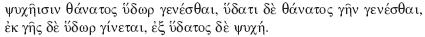 Con el empleo de la palabra 'alma' en este contexto, donde aparece insertada expresamente en un proceso físico de metamorfosis sucesivas en las que el trastrocamiento de una substancia anterior en otra nueva conlleva la 'muerte' o disolución de la primera,49 cabe comparar en especial otro fragmento de Heráclito que describe el ciclo de las o