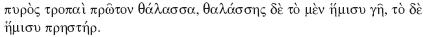 ,3 demuestra aun así su apego a dicho dogma cuando asigna de manera inequívoca a la tierra la función de fuente primera y destino final de todas las cosas, declaración que leemos en un hexámetro que reproducimos textualmente: